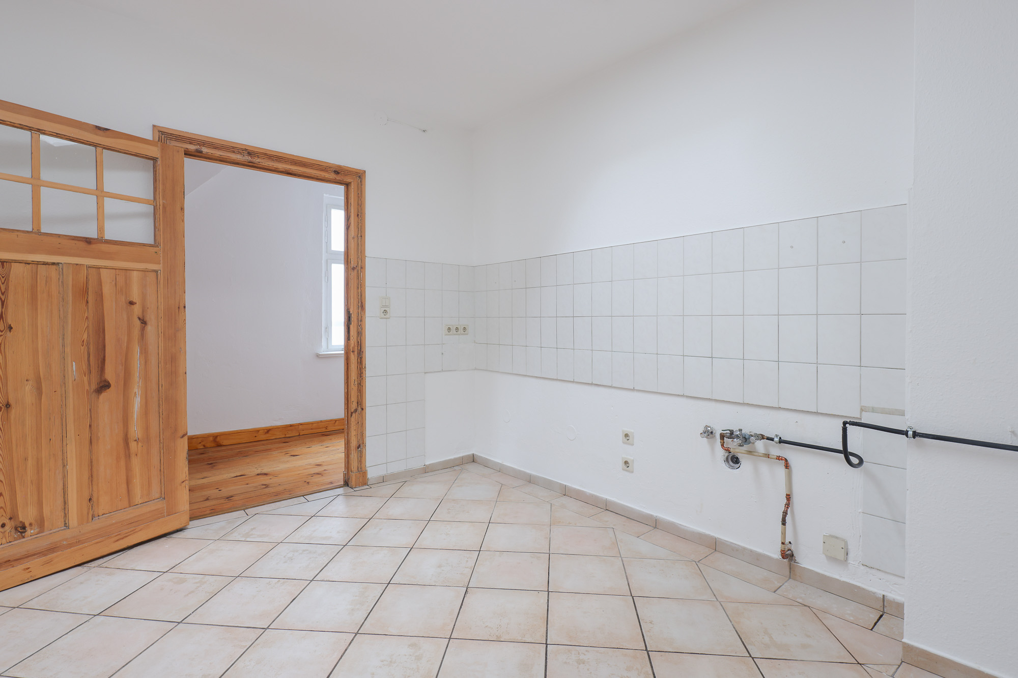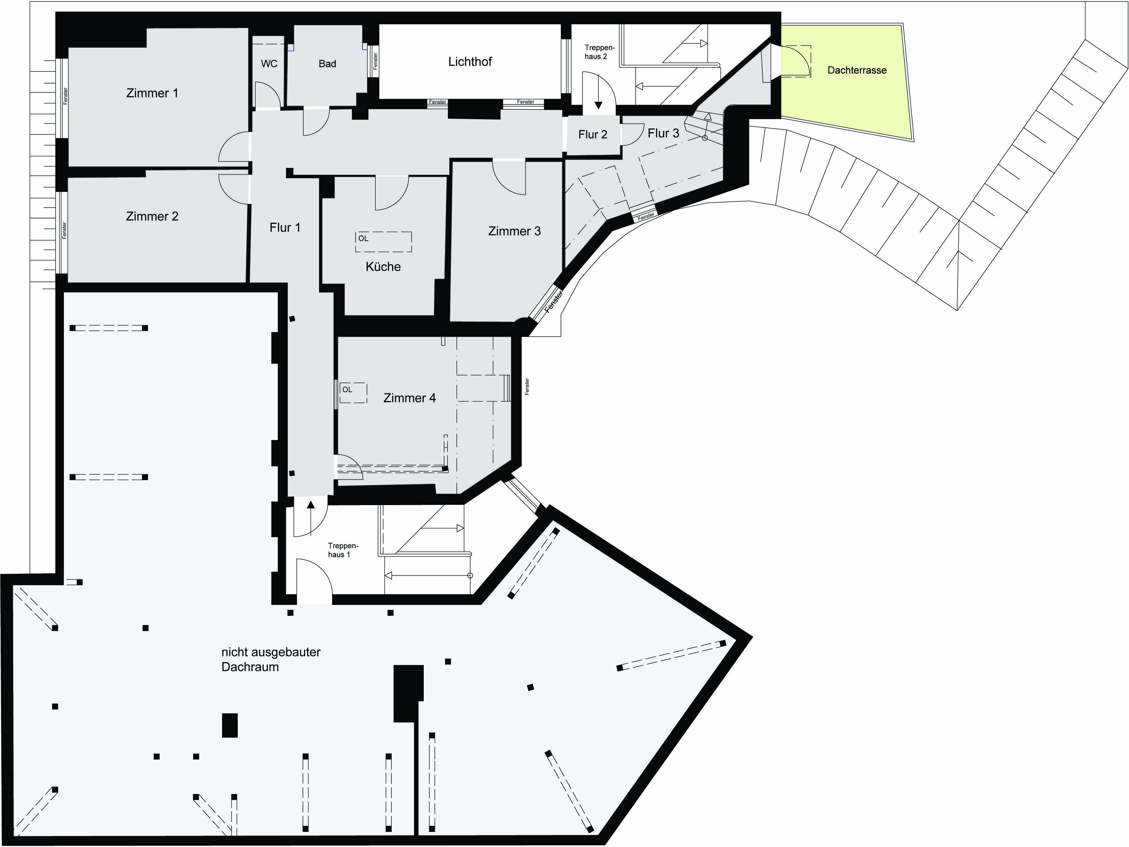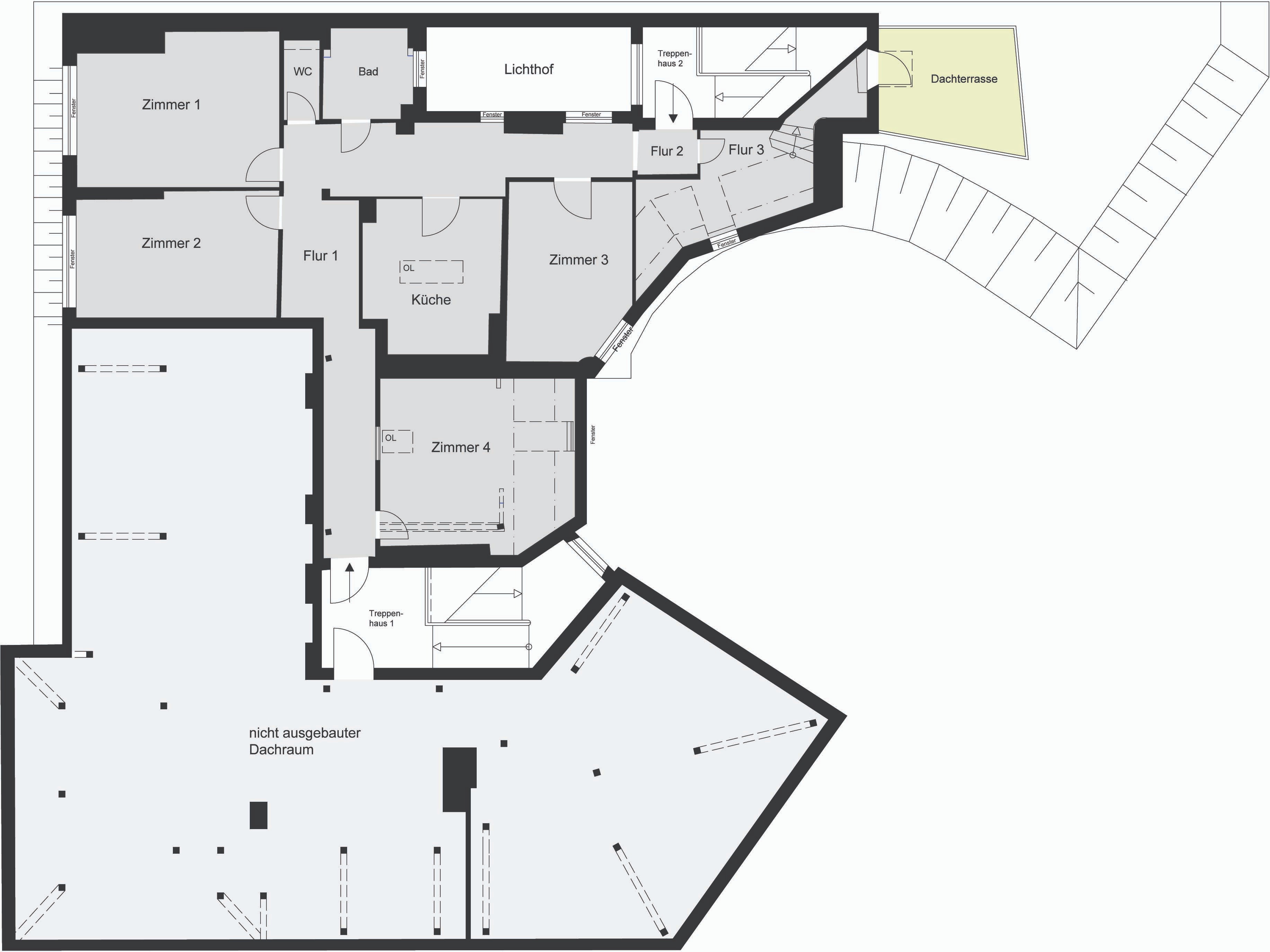 Die Dachgeschosswohnung verfügt über vier Zimmer, ein Badezimmer mit Badewanne, ein Gäste-WC sowie zwei großzügige Flurbereiche. Des Weiteren gibt es einen großen Küchenraum mit Oberlicht, das geöffnet werden kann, sodass auch hier für Tageslicht und Frischluft gesorgt ist. Ein Durchgangsraum zur Dachterrasse kann als zusätzliches kleines Zimmer oder dritter Flurbereich genutzt werden.