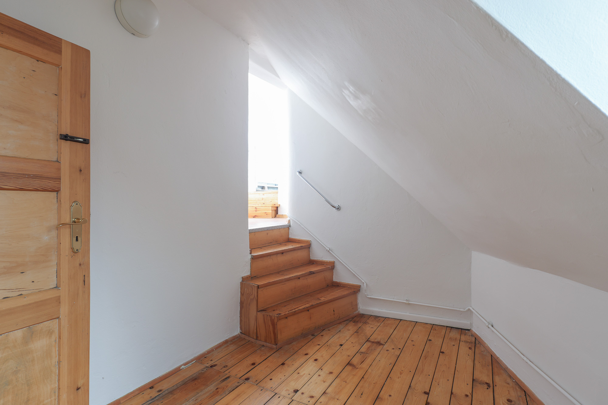 Der Charme des Berliner Altbaus spiegelt sich in den alten Dielenfußböden, hübschen kleinen Fenstern zum Lichthof hin und in den vielen liebevollen Details des Gebäudes wider. Wer das Besondere eines Altbaus und den Luxus einer Dachgeschosswohnung sucht, wird hier fündig! Die Holzbalkenkonstruktion des Dachstuhls wurde zum Teil sichtbar in die Wohnräume integriert, was das Ambiente der Wohnung noch einmal unterstreicht. Die Ausrichtung der Wohnräume nach Ost und West bringt viel Licht in die Wohnräume. Die zum Innenhof gelegene Dachterrasse verspricht ruhige und sonnige Stunden hoch oben über den Dächern Berlins. Eine Wohn-Oase zum Verlieben!