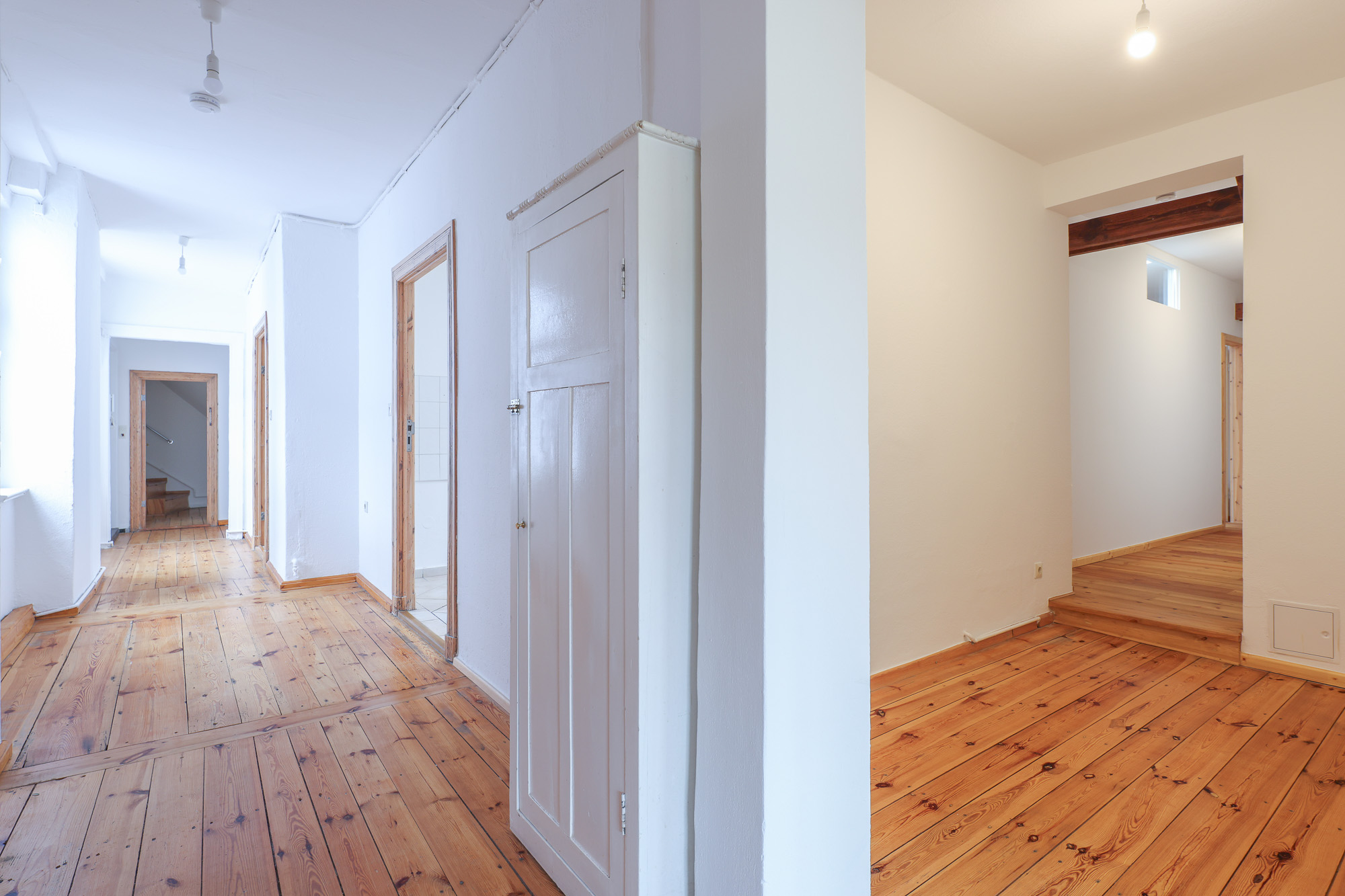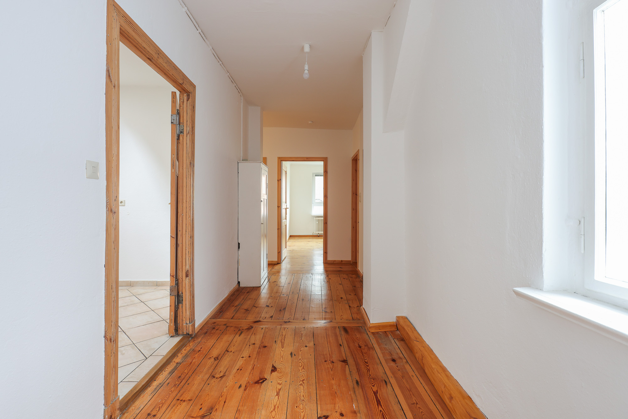 In den Fluren sowie in den Wohnräumen (Zimmer 1, 2, 4) sind - ganz Berliner Altbau-Stil - Holzdielen vorhanden. Bei den Fenstern handelt es sich überwiegend um zweifach verglaste Kunststofffenster, die zum Teil mit Jalousien ausgestattet sind. Das Oberlicht in Zimmer 4 kann elektrisch geöffnet werden.