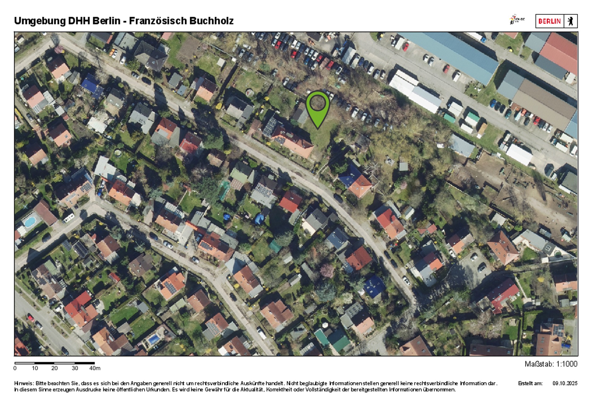 Die Doppelhaushälfte liegt in einer angenehm ruhigen Anwohnerstraße im grünen Norden Pankows, mitten im beliebten Ortsteil Französisch Buchholz. Hier zeigt sich Berlin von seiner entspannten und familienfreundlichen Seite: kleine Straßen, viel Natur und eine Nachbarschaft, in der Kinder aufwachsen und Erwachsene zur Ruhe kommen können.